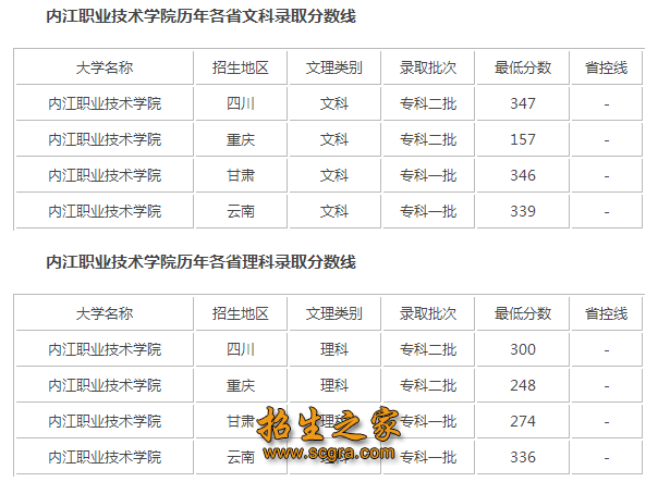 内江职业技术学院2019年录取分数线:2019年录取分数线暂未公办,招生之家为各位考生整理了往年的录取分数线,内江职业技术学校每年录取分数线差别都不大,供大家参考。